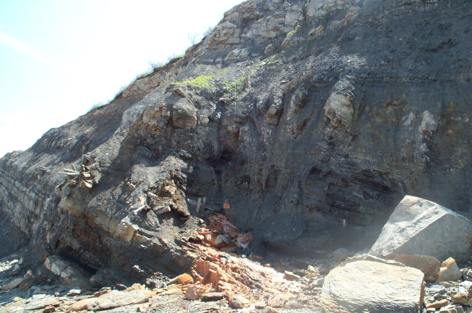 The Fundy seam (aka the Hardscrabble seam) outcrops on the shore a short distance north of Joggins. A total of seven mines operated on the seam at various times and it was also one of the most bootlegged coal seams in Nova Scotia.